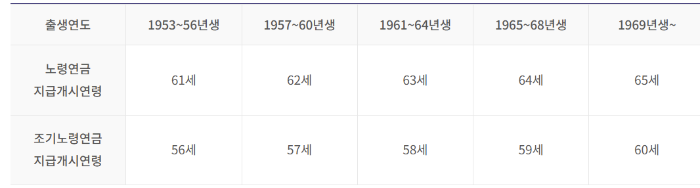 | 출생년도 | 국민연금 지급 개시 연령 |